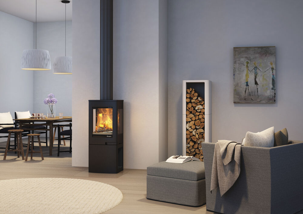 Käytännölliset ominaisuudet kuten itsestään sulkeutuva ovi, integroitu tuhkalaatikko ja käyttäjäystävällinen kahva tekevät kamiinan käytöstä sekä turvallista että helppoa