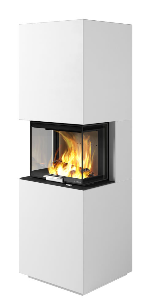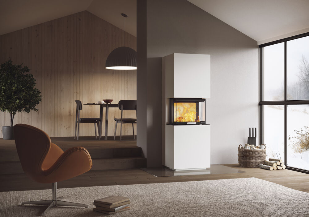 Ylellinen hissiluukullinen takkasydän, josta hyvä näkymä liekkeihin kolmelta sivulta.