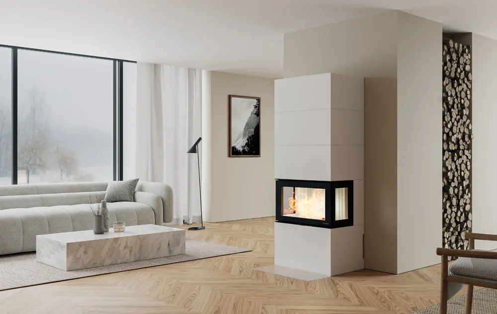 Salzburg U est un foyer à accumulation de chaleur qui garantit une chaleur efficace et durable. Les vitres latérales permettent de voir les flammes sous plusieurs angles et, grâce à son design épuré et élégant, la cheminée s'intègre dans la plupart des maisons.