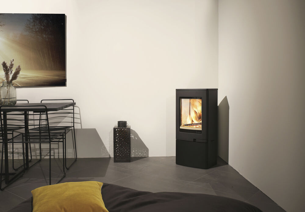 Duo 5 DV er en klassisk peisovn med stort frontglass for godt innsyn til flammene og en praktisk sokkel med dør.